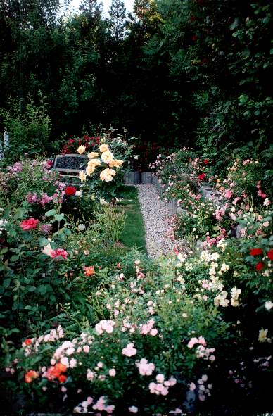 Rechts Tröge mit Zwergrosen in der Mitte Hochstamm Bernsteinrose