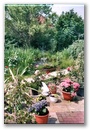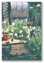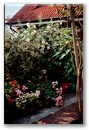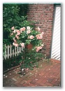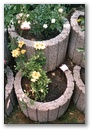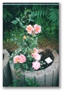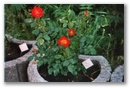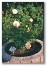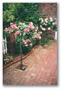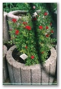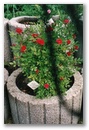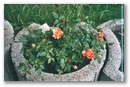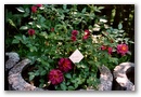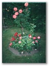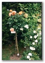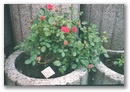 Rechts Tröge mit Zwergrosen in der Mitte Hochstamm Bernsteinrose